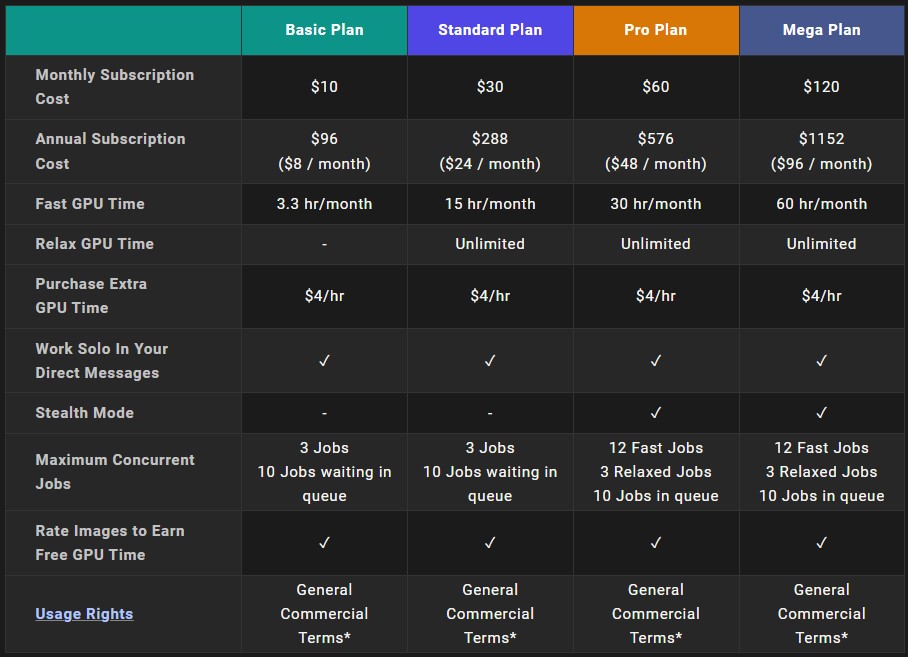 ยิ่งแพงยิ่งได้เวลาใช้งานมาก และมีฟีเจอร์พิเศษเพิ่ม เช่น โหมดซ่อนตัว ในแพ็กเกจโปรและเมกะแพลนทุกแพ็กเกจสามารถซื้อเวลาเพิ่มได้ชั่วโมงละ $4 เท่ากันหมด ถ้าสมัครเป็นรายปีจะถูกกว่าจ่ายรายเดือนประมาณ 20% สุดท้าย ทุกแพ็กเกจใช้งานเพื่อการค้าได้ และมีโอกาสได้เวลาฟรีจากการให้คะแนนรูปภาพ